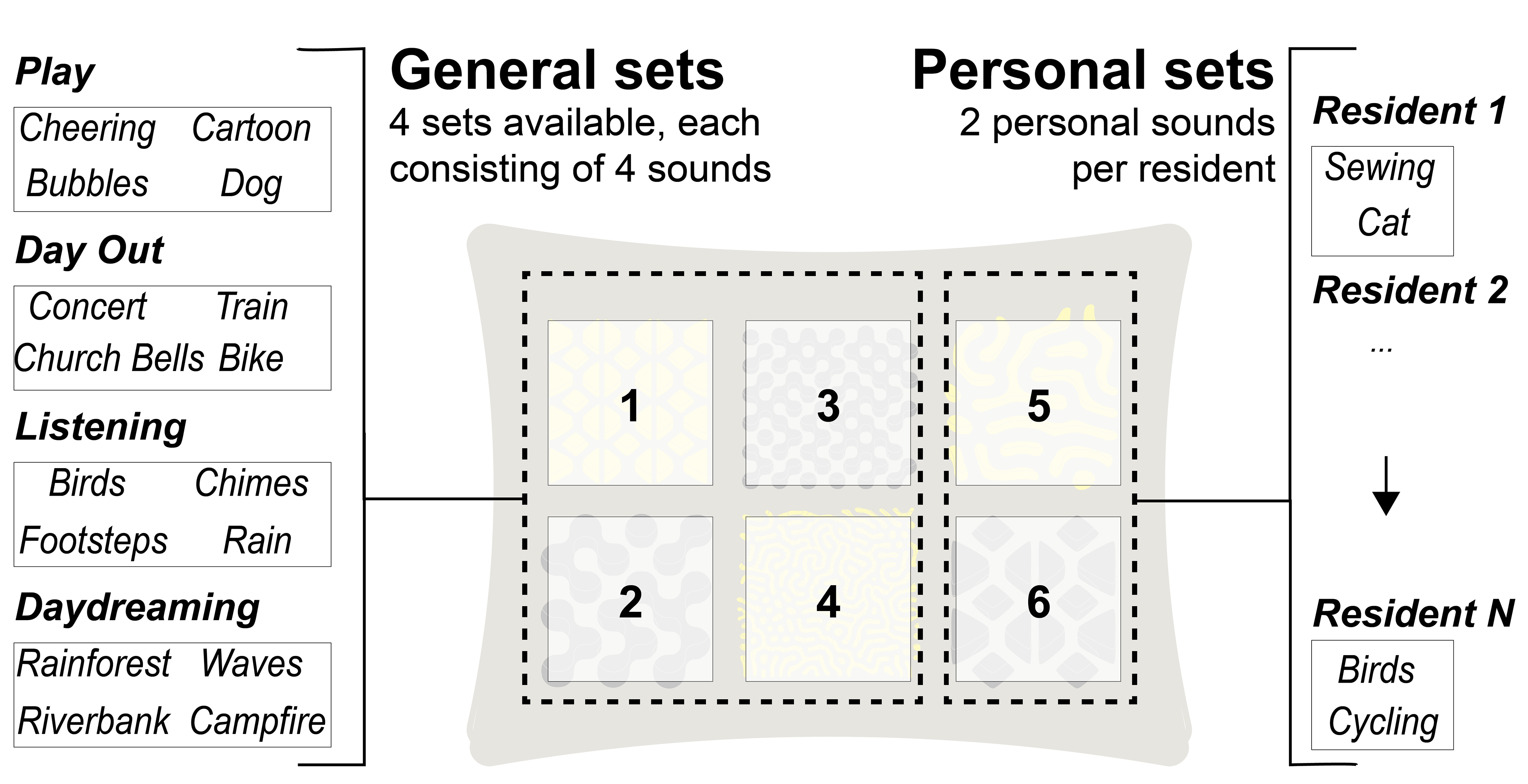 For this study, a mix of personal sounds for every participant, and general sound sets were designed. Each participant had two personal sounds, based on background information or personal interests. In addition, there were four different general sound sets: Play!, Day out, Listening and Daydreaming.