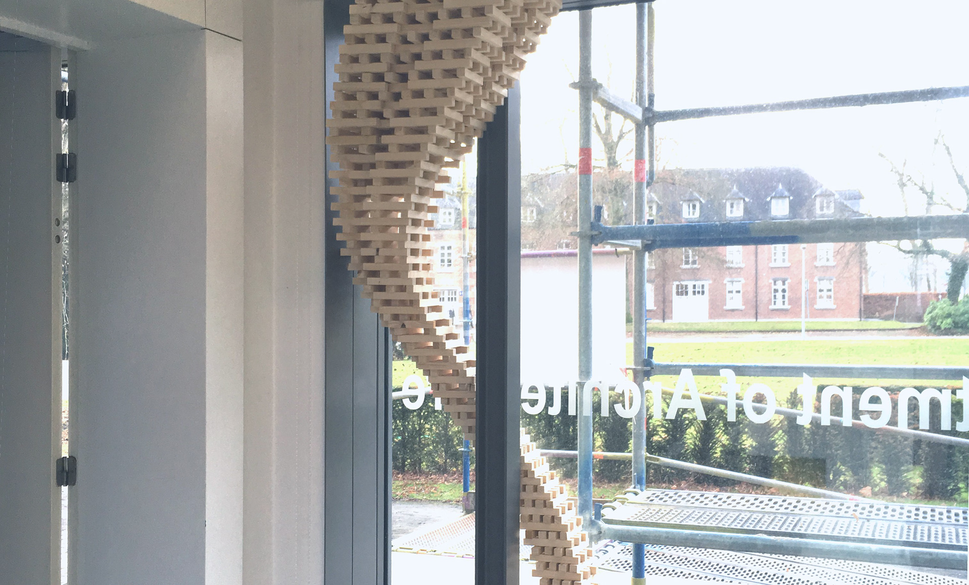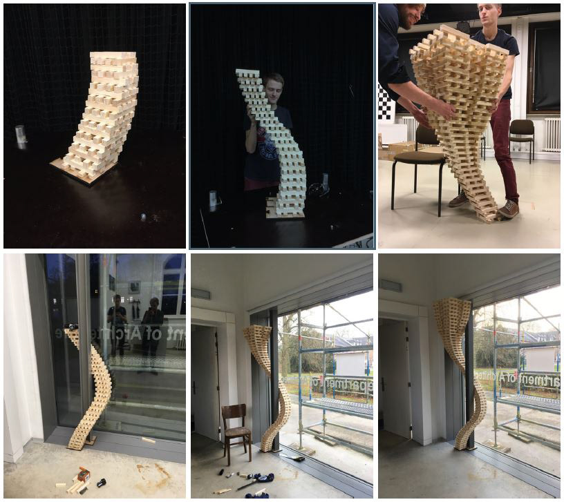 An organic entity starts from a small diameter and increases gradually in size whilst crawling around a thin steel column. The spiral movement provides to the structure multiple support points on the column to carry the eccentric load of the heavier top part. The relation with the context is crucial as without context it couldn’t exist. Furthermore this design respects the architectural intentions and the subtlety of the thinly dimensioned column. The structure is formed by layers of squares, each individually scaled and translated in space along a smooth curve. An algorithm calculates the number and layout of the individual pieces of wood, based on the size of the square. Each layer is rotated 90° in order to stack and attach the following layers to each other.